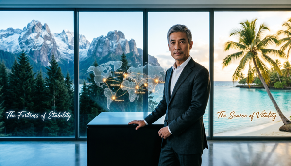 Configuration optimale combinant patrimoine structuré dans une juridiction stable (ex: Holding Suisse) et résidence fiscale dans une juridiction légère (ex: Maurice), permettant souveraineté + optimisation.